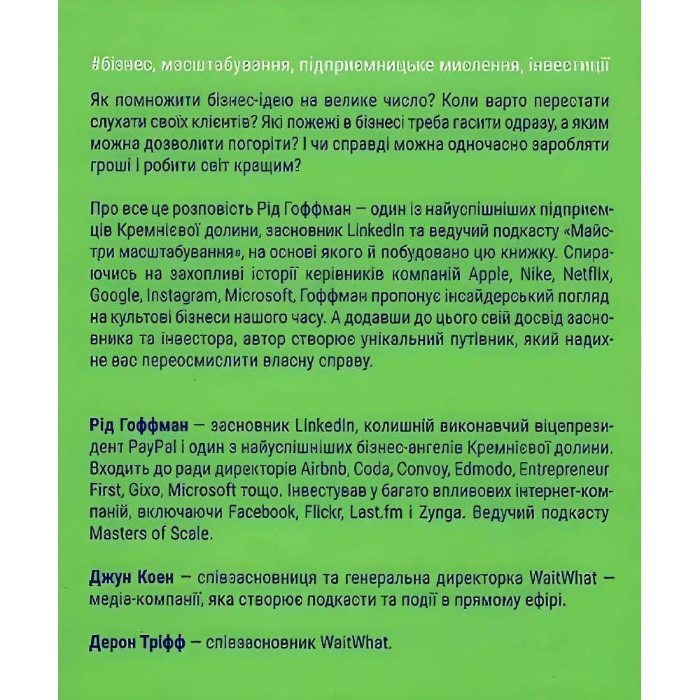 Ключем до масштабування бізнесу є не талант чи стратегія, а підприємницьке мислення, яке можна (і треба) розвивати. У цьому впевнений Рід Гофман — один із найуспішніших підприємців Кремнієвої долини, засновник LinkedIn та ведучий подкасту «Майстри масштабування», на основі якого і побудована ця книжка.