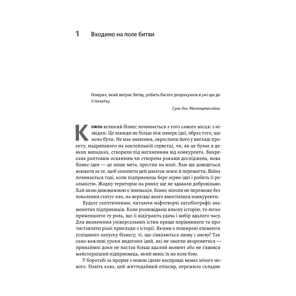 Війна в бізнесі може бути не менш жорстокою, ніж на полі бою — конкуренти запросто пускають в хід найпідступнішу зброю в боротьбі за прибуток та нових клієнтів. Сильніші компанії при цьому не зупиняються, допоки не знищать дрібних конкурентів, а найменша помилка може стати причиною краху всієї компанії. Автор глибоко дослідив найвідоміші суперництва в історії бізнесу, щоб у цій книжці викласти правила ведення бою з конкурентами. У ній він розповідає, як сформувати тактику, яка поєднуватиме розум та інновації, правильну маркетинг-стратегію та натхненність команди, уміння йти на ризик та планувати кроки наперед.
