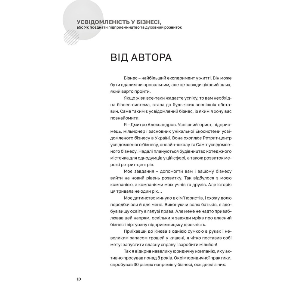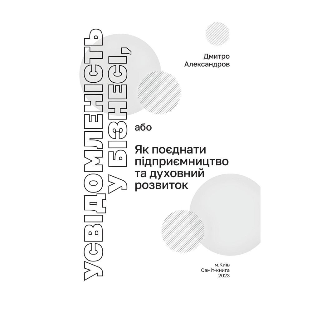 Ця книга призначена насамперед для підприємців. Адже бізнес у сучасних умовах, особливо після повномасштабного вторгнення, чи не найбільше стикається з проблемами і вимагає пошуку ефективних і адекватних рішень. А підприємництво – це основа економіки України, фінансова міць держави, сплата податків, а отже, гарантія підтримки, зокрема, військового комплексу та соціальної сфери. Як бачимо, все у нашому житті взаємопов’язане. Від правильних рішень справді залежить багато. Книга «Усвідомленість у бізнесі» Дмитра Александрова покликана навчити й допомогти підприємцям не впадати в розпач у складних умовах, а думати, шукати і знаходити. Книга вчить перемагати! Крім того, вона стане в пригоді кожному, хто хоче бути впевненою в собі, сильною і успішною Особистістю.