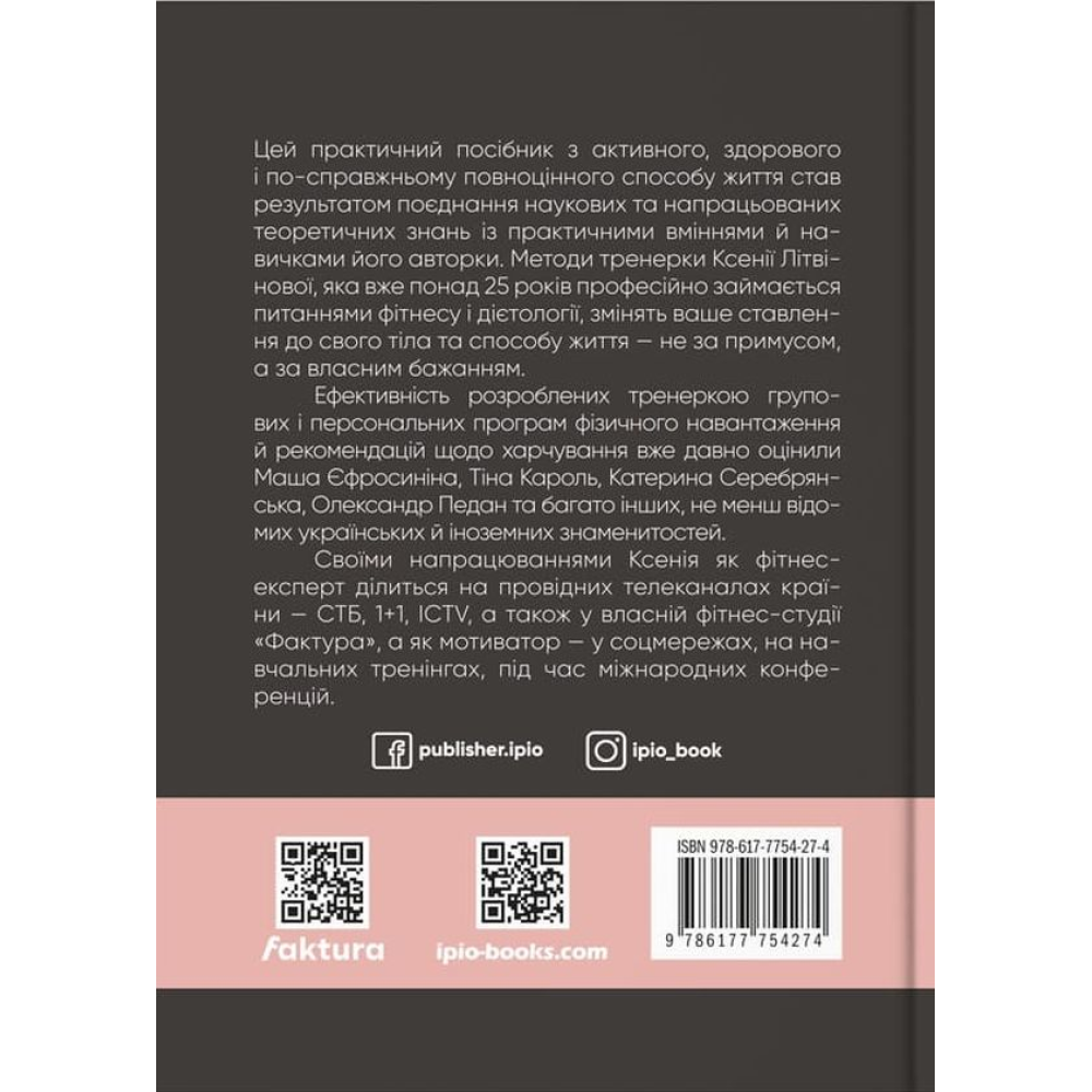 Авторка — Ксенія Літвінова, відома фітнес-тренерка, телеведуча та експертка зі здорового способу життя, ділиться не просто порадами про тренування чи харчування, а глибоким розумінням взаємозв’язку тіла, емоцій і свідомості.