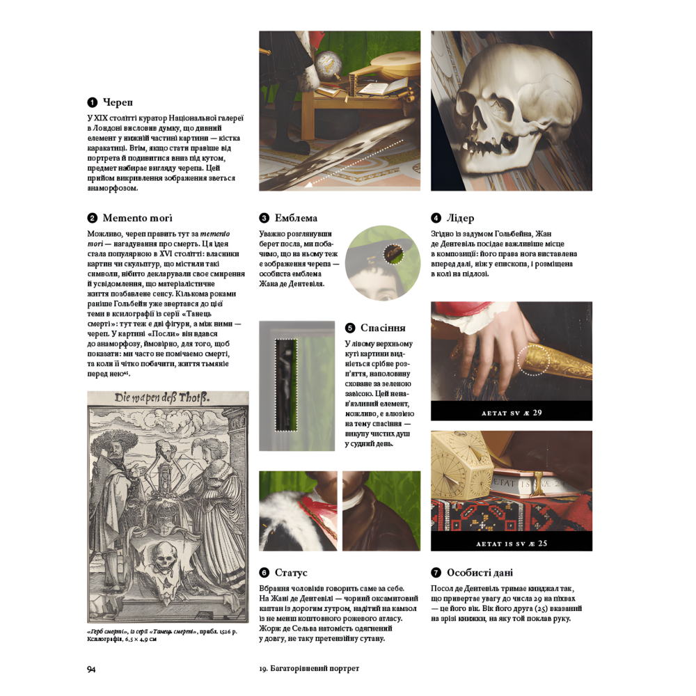Книга навчає читати картини, як читають книжки: звертати увагу на деталі, колір, композицію, символи, пози персонажів, світло й тіні.