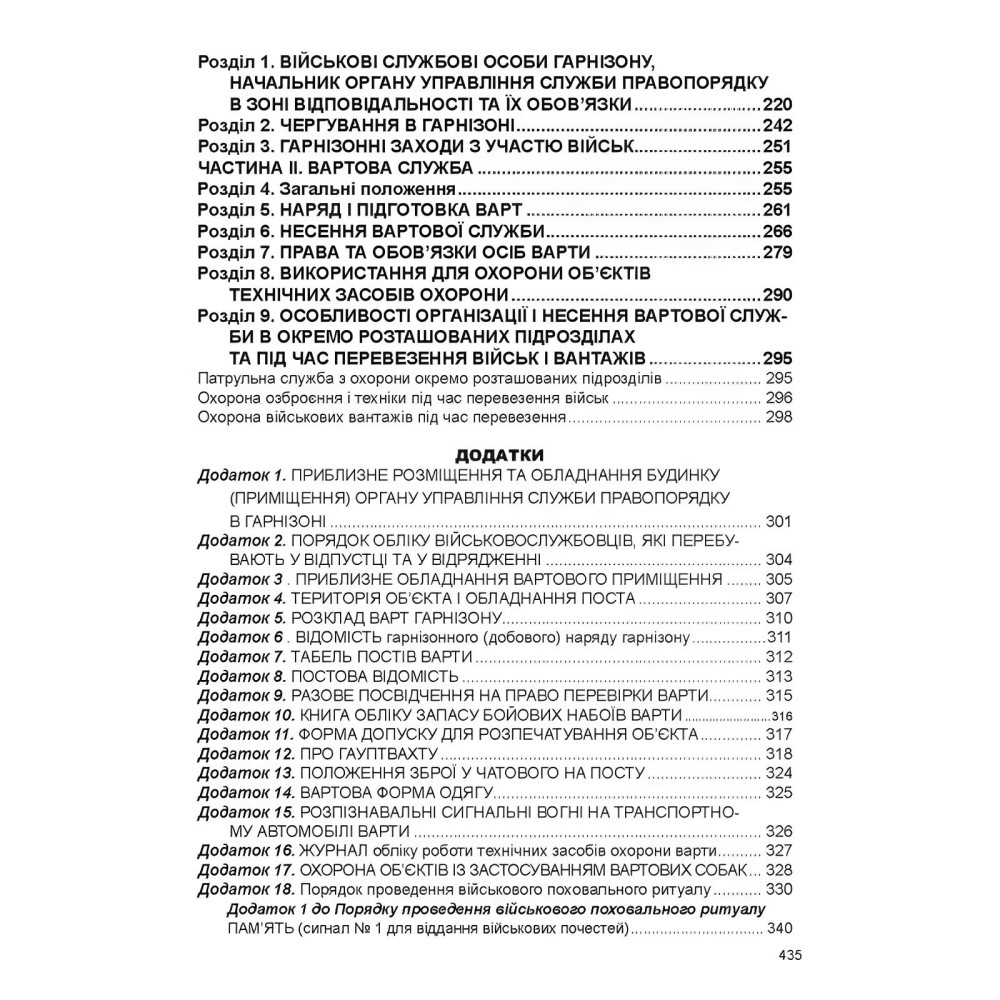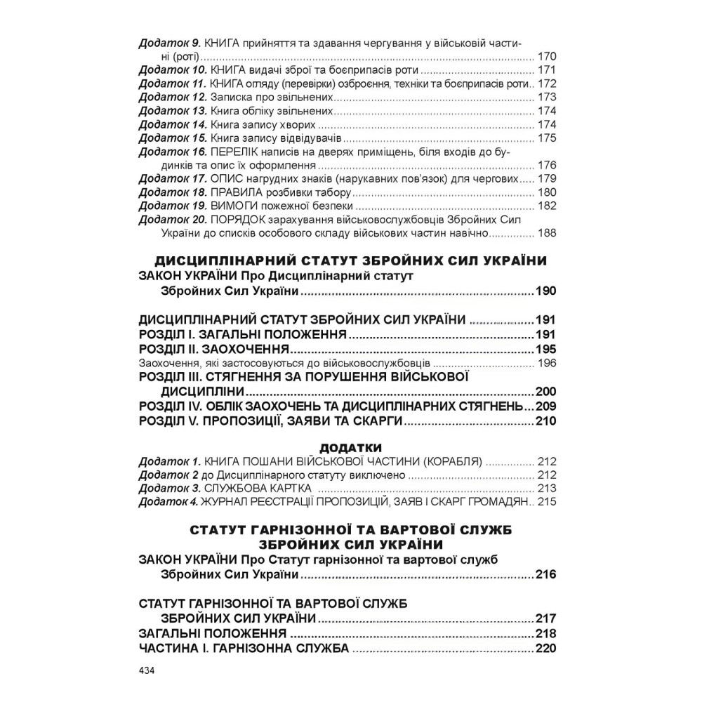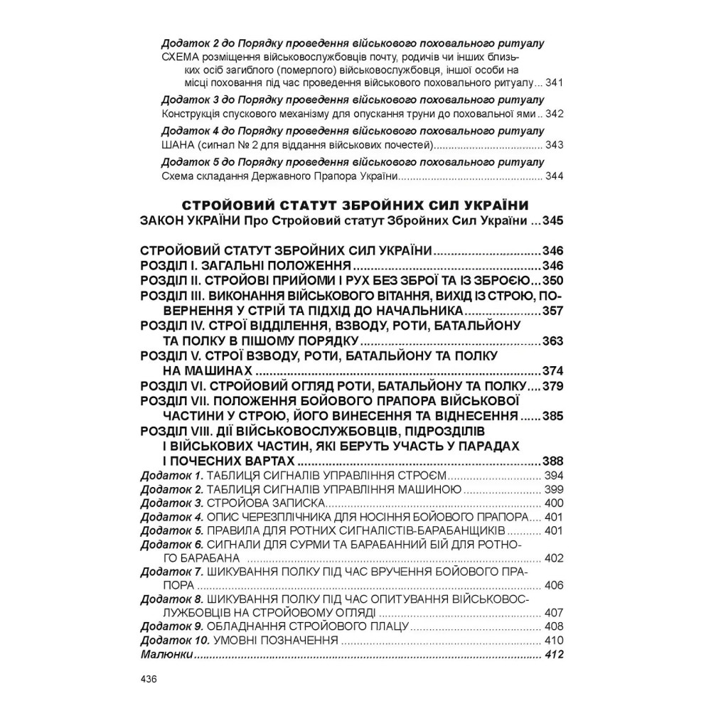 У виданні представлені «Статут внутрішньої служби Збройних Сил України», «Дисциплінарний статут Збройних Сил України», «Статут гарнізонної та вартової служб Збройних Сил України», «Стройовий статут Збройних Сил України».
