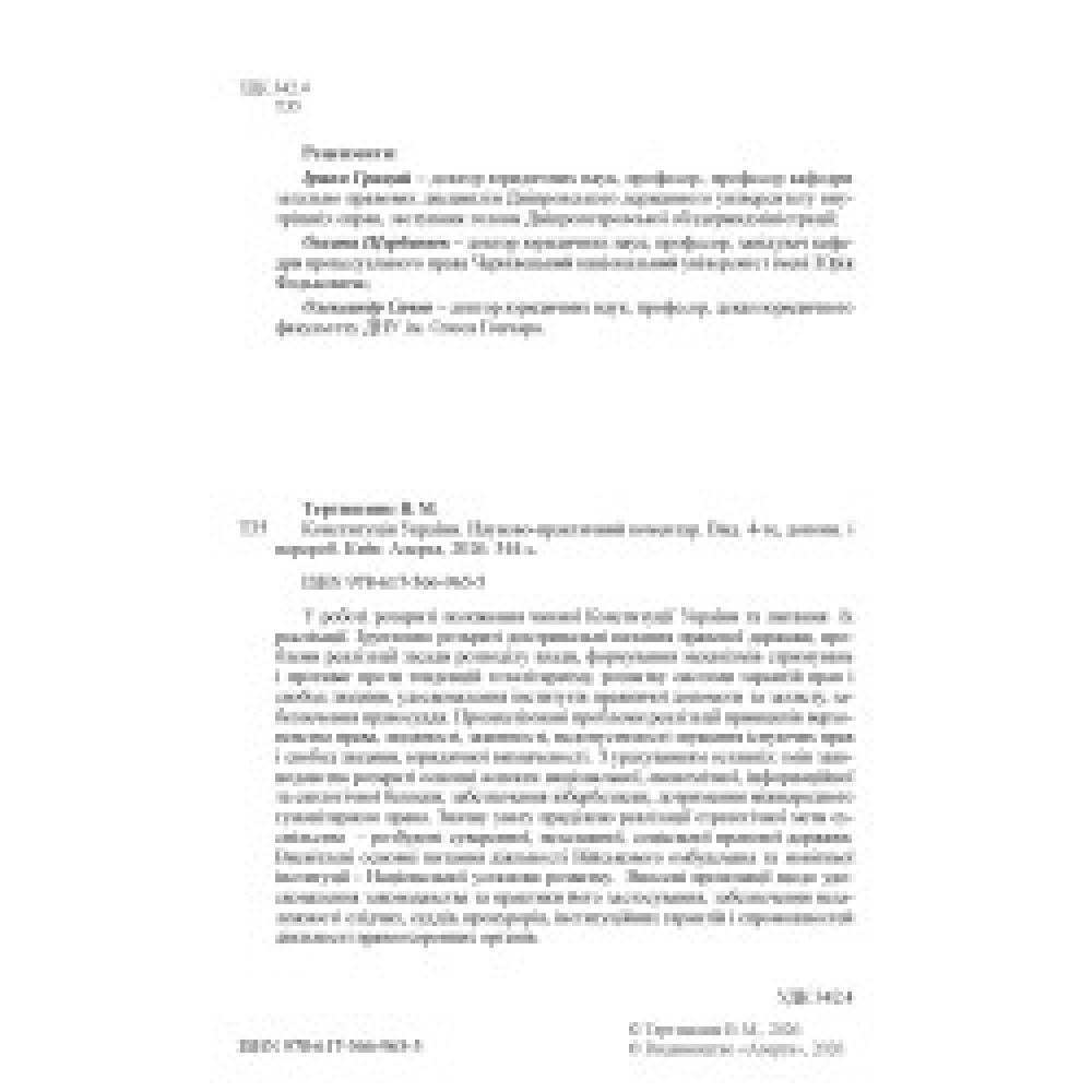 У роботі розкриті положення чинної Конституції України та питання їх реалізації. Ґрунтовно розкриті доктринальні питання правової держави, проблеми реалізації засади розподілу влади, формування механізмів стримувань і противаг проти тенденцій тоталітаризму, розвитку системи гарантій прав і свобод людини, удосконалення інститутів правничої допомоги та захисту, забезпечення правосуддя. Проаналізовані проблеми реалізації принципів верховенства права, людяності, законності, недопустимості звуження існуючих прав і свобод людини, юридичної визначеності. З урахуванням останніх змін законодавства розкриті основні аспекти національної, економічної, інформаційної та екологічної безпеки, забезпечення кібербезпеки, дотримання міжнародного гуманітарного права. Значну увагу приділено реалізації стратегічної мети суспільства – розбудові суверенної, незалежної, соціальної правової держави. Висвітлені основні питання діяльності Військового омбудсмана та новітньої інституції - Національної установи розвитку. Внесені пропозиції щодо удосконалення законодавства та практики його застосування, забезпечення незалежності слідчих, суддів, прокурорів, інституційних гарантій і спроможностей діяльності правоохоронних органів.
